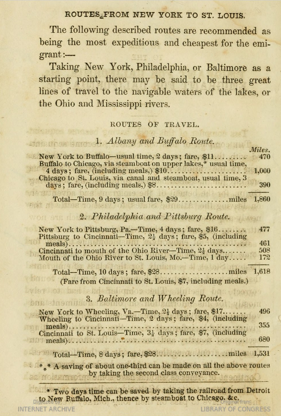Now, in the 1840s and 50s, the Emigrant Guide offered advice for getting from New York to St. Louis (and thence to Independence, St. Josephs, or one of the other jumping off points). It appeared to mostly consist of steamboats, interestingly, with an option of trains.