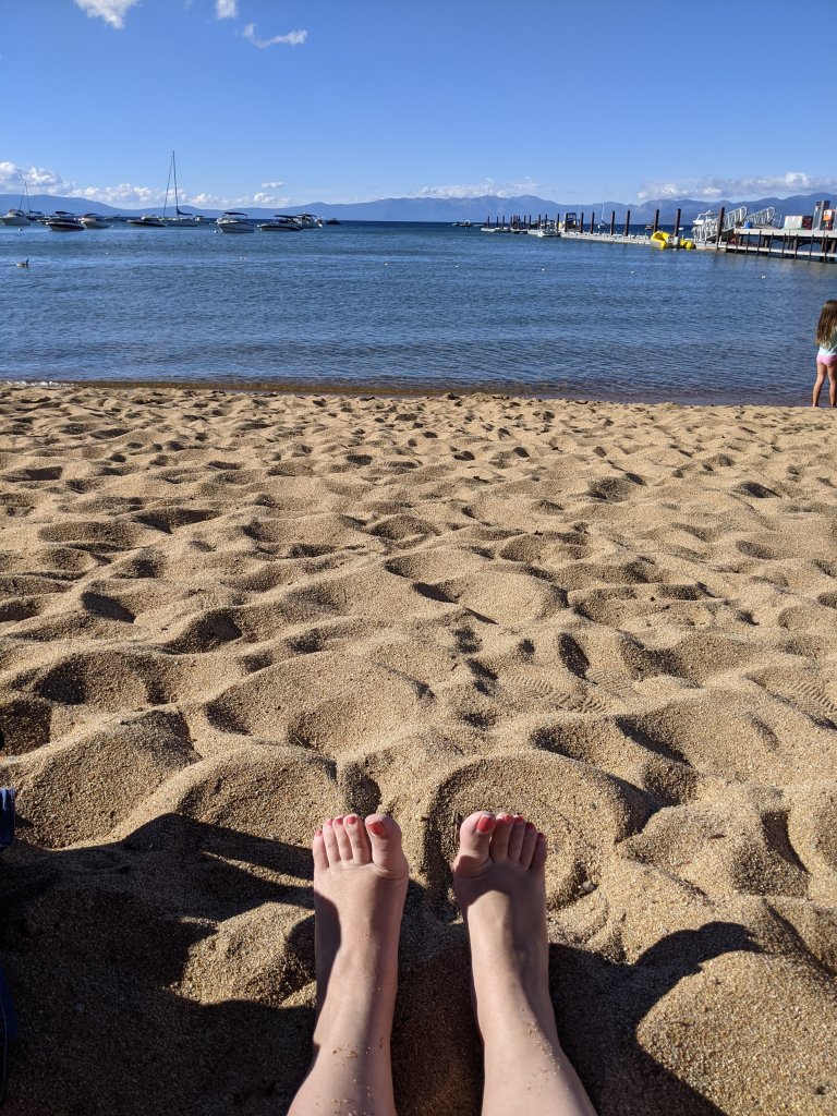We went out of the way tonight to head over to Camp Richardson at Lake Tahoe for…what else?…to see and spend some time at the lake. I confess, I didn’t understand what the big deal was. I mean, it’s just another lake right? But when we came around the corner and saw that gorgeous shining body of water surrounded by mountains on all sides except for the sandy beach, I could hardly believe it. It’s seriously was like a haven in the middle of nowhere. So, we grabbed our bathing suits, didn’t bother to set up the tent, and I am now chilling on a beach looking out over the water. And the mountains. Does it get any better?