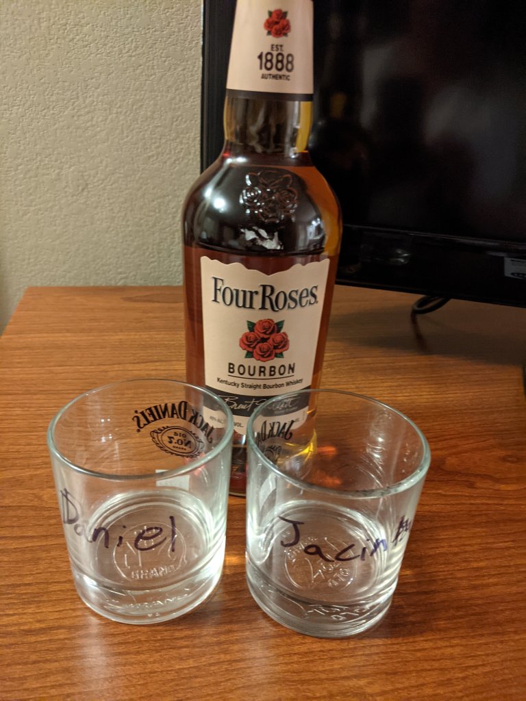 Sure enough, when we grabbed a bottle of bourbon and brought it up to the counter, he told us to wait a moment, ran to the shelf, grabbed a couple of glasses, and, with permanent marker, inscribed our names. We laughed so hard we almost cried.