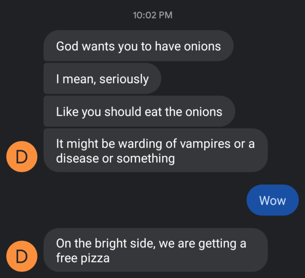Yup. They’d forgotten to take the onions off, despite the special request. So now we are sitting here with four full-sized pizzas, three of which I refuse to touch. I don’t think Daniel will be hungry for a few days.