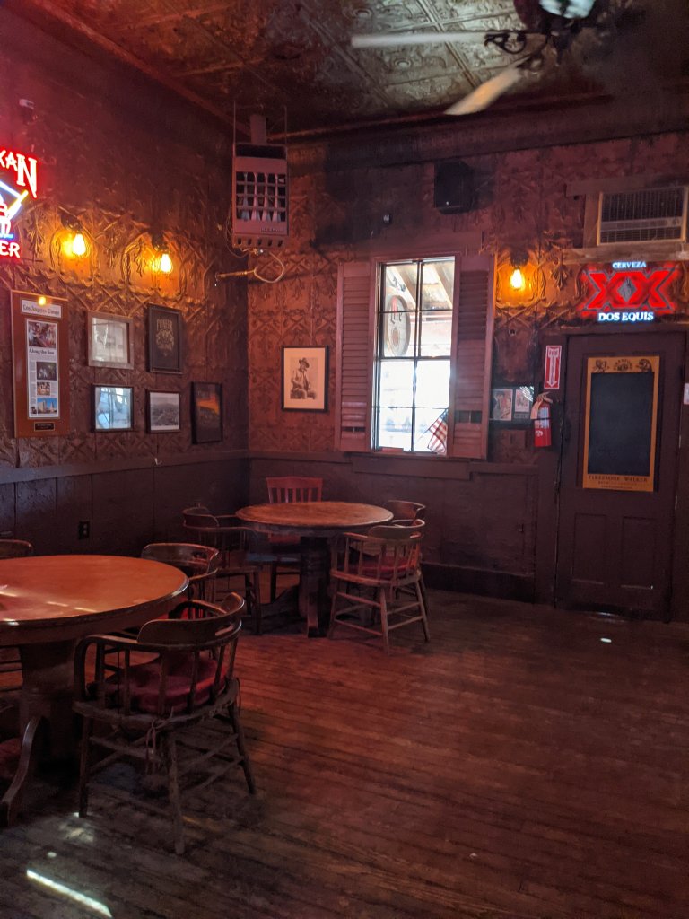 I insisted we stop at the Pioneer Saloon in Goodsprings, Nevada when I found out that Clark Gable had once been there. More specifically, he had been there for 3 days while waiting for the body of his wife to be recovered following a plane crash. Which is obviously depressing, But it was still super cool that this was the saloon in which Clark Gable sat. It was just as one would envision an old saloon, and the bartender was precisely what one would expect for a bartender in a little town in Nevada. It was small, didn’t you, had a jukebox, and an assorted array of beverages, along with a few things for tourists. It was far less crowded than I expected, but that was a delightful surprise for an introvert. There were really only a few locals with us, and a couple of other passers-through. We had a perfectly delightful time, and I even got pictures next to the old cigar burns where Clark Gable fell asleep waiting for news of his wife.