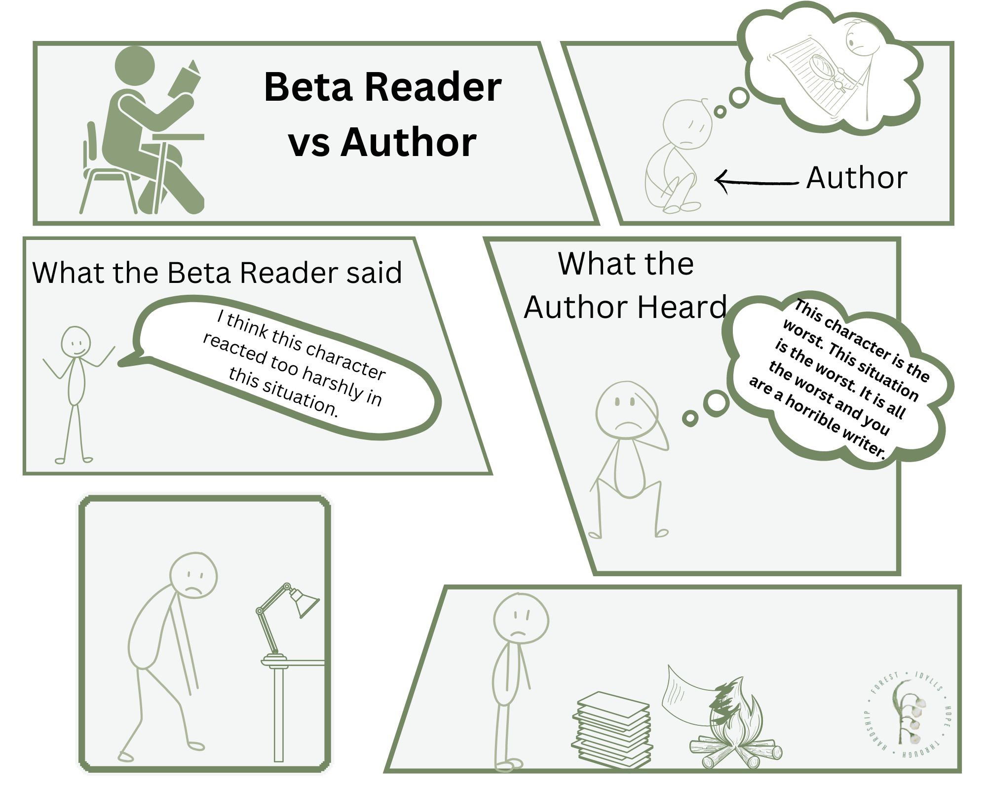 As I told my husband on Friday, I need to start a comic line about beta readers vs authors, showing interpretations. Like this: