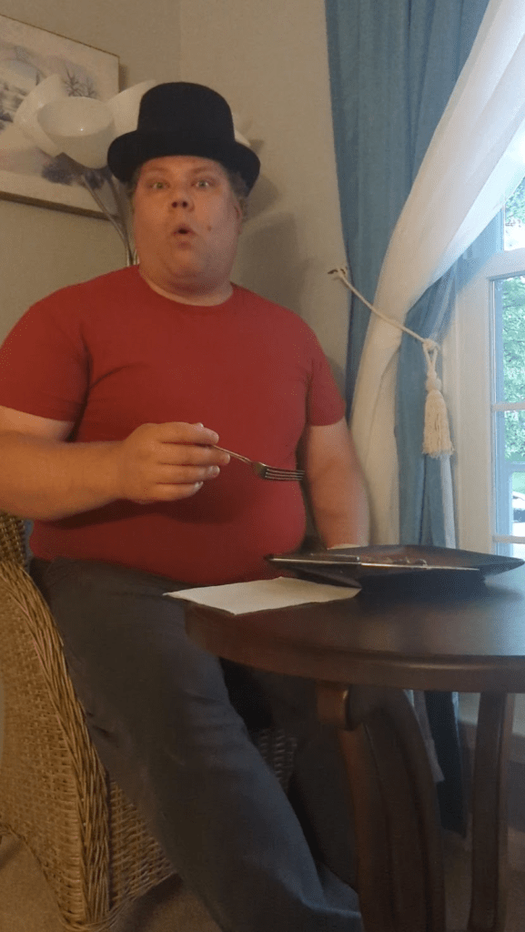 And then it was time! The moment of truth! I got a knife and sliced the beef. It was…perfect. I have rarely had such a tender roast. The knife slipped through it like butter, though there was no sign of the stuffing I’d put in it. I laid a slice on the plate, and went back to the boiling liquid for the stuffing balls…But they weren’t there. Well. Not much of them anyway. Apparently they didn’t appreciate the way I’d forced them to conform because they’d completely disintegrated. A couple little tiny things were all that was left of the group I’d put in, so on the plate they went! And even though the recipe didn’t say to do so, I poured some of the liquid over the beef, because who wants all that good wine to go to waste on some ungrateful stuffing balls?