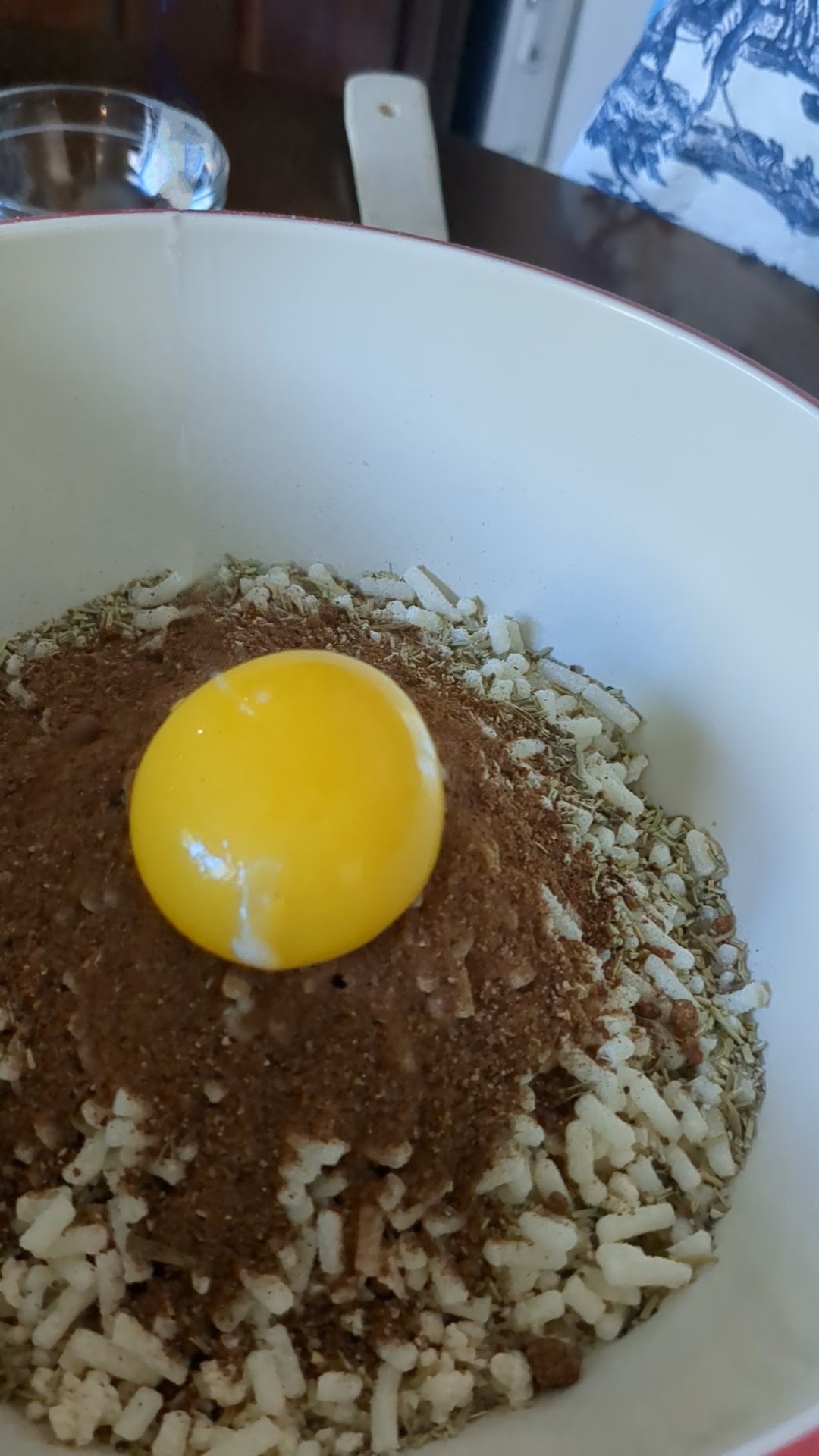 Add the yolk of an egg. This is when I realized I might have made a mistake in not melting the suet first. Because one egg yolk was definitely not interested in turning all those ingredients into the consistency of stuffing.