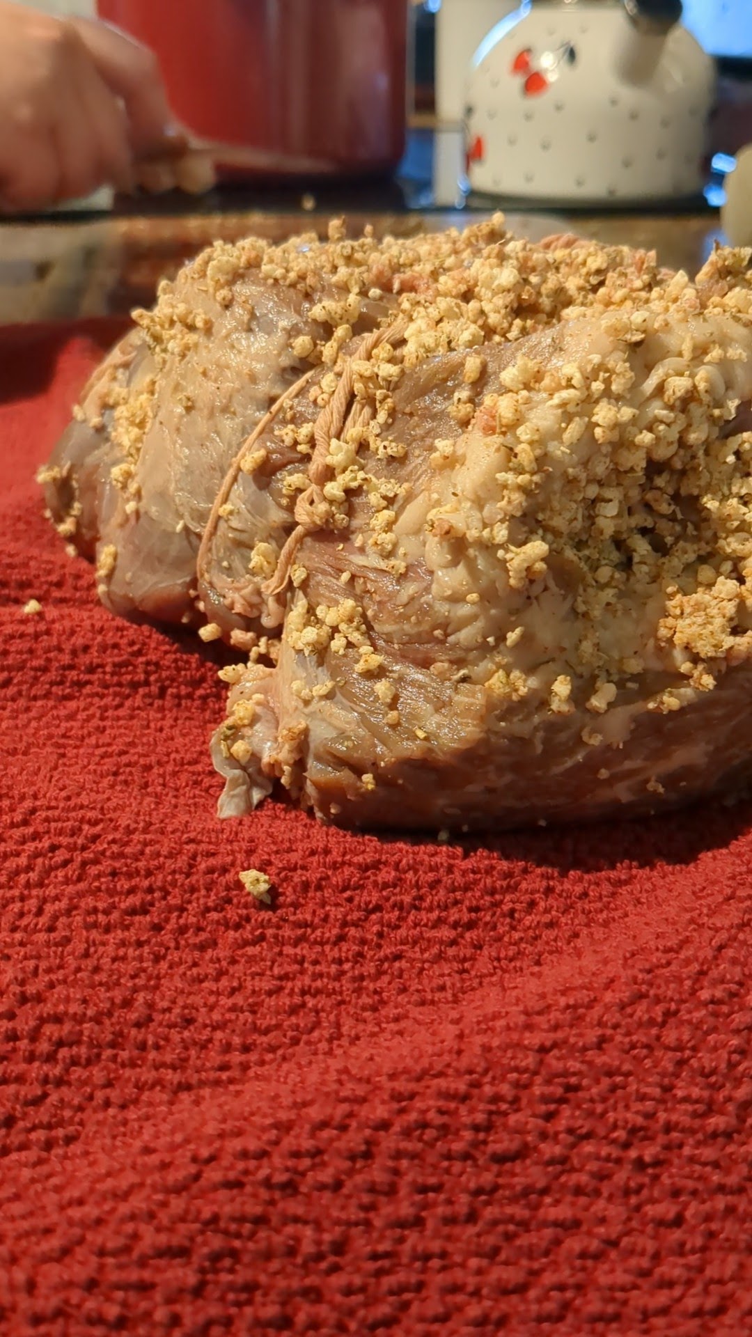 First – tie up a round of beef. Now, I’ve had lots of recipes tell me to tie my roasts, etc., before…but I admit it took this recipe to finally force me to actually buy cooking string. So, for the first time ever, I listened to the instructions, and tied the beef. Simple enough, if you don’t overthink how many strings you should use…