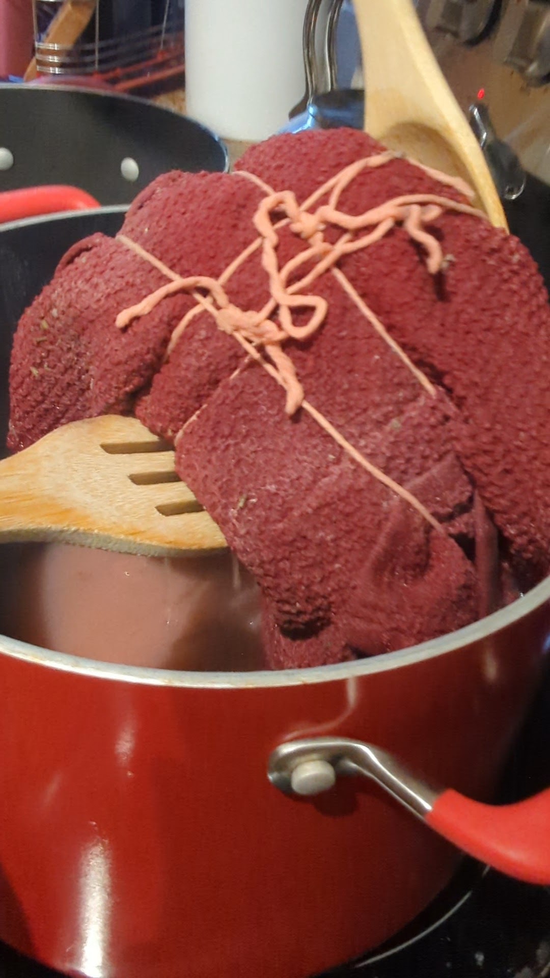 Then tie up the beef in a towel, cover it in water and let it boil. I’m here now to tell you…when someone tells you to boil something in a towel, do not choose a red towel, no matter how many years you’ve had it and think the color has been washed out. Yup. But I, clear-thinking I, decided on red because it matched the color of beef and was therefore less likely to stain. Yes. You may roll your eyes. That beef was boiled for an hour and a half, turned over and boiled another hour and a half, and I may tell you that when I took it out, there was no way on God’s green earth I was going to use that bright pink liquid to do the next step. Nope. Down the drain it went. I was actually a little nervous about how much must have seeped into the beef as well, but Daniel convinced me it couldn’t have lasting effects because we had owned the towel for ten years, washing it almost weekly – so what harm could it possibly still have in it? He had a good point, but if I ever do this again, I am using a white towel, no matter how stained it might get.