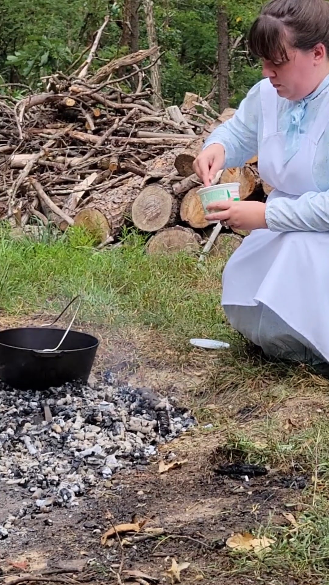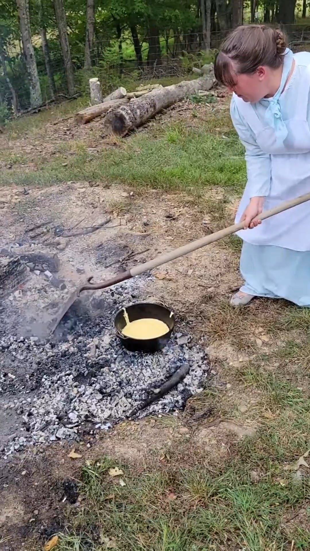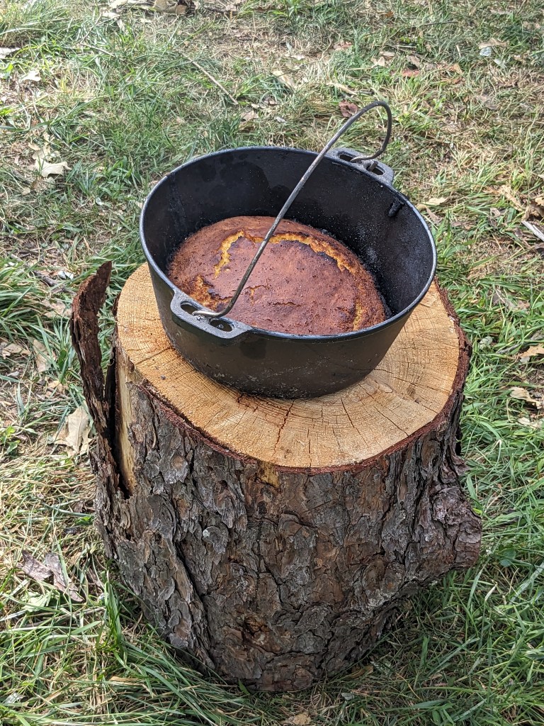 I moved in again long enough to pour the batter into the pot and again used the stick to try and even out the pot so all the batter didn’t shift to one side. Then we scraped coals off the lid and, after a couple tries, managed to place it on top of the pot, still using the stick (seriously, what did they use to lift the hot, pre-heated lid? Why isn’t this mentioned in diaries??) But once we finally got it on, we piled coals on top and around the pot and left it to cook.