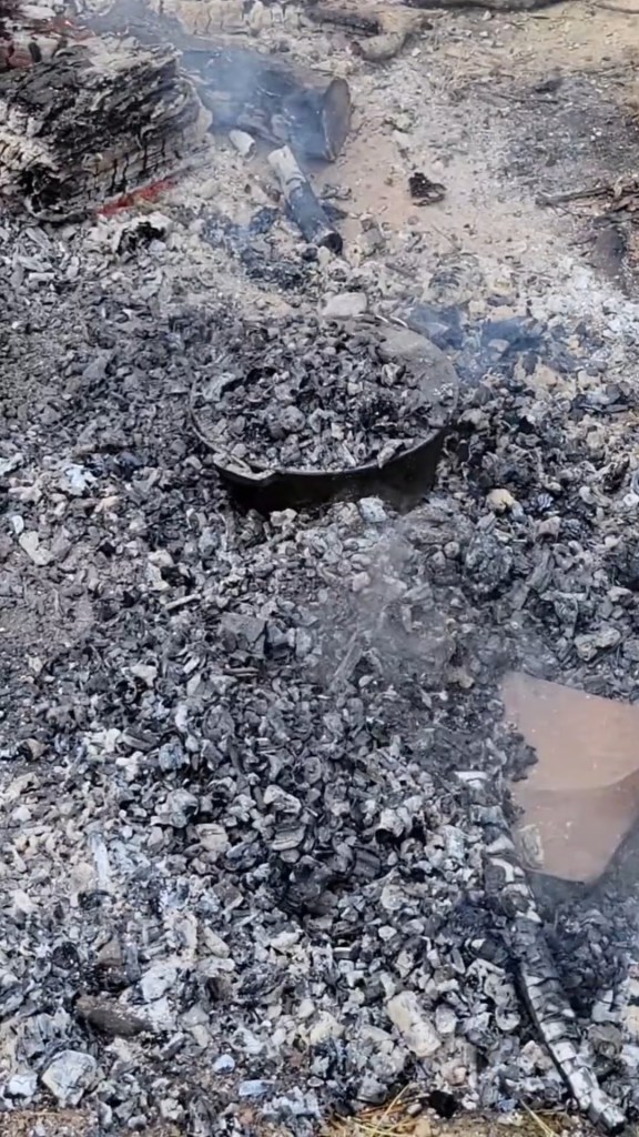 Okay, with the batter ready and secured against flying invaders, time to check on the coals. The guys were quite thorough… and took advantage of my need of a fire to burn fallen trees and brush, which meant the giant flames had to be taken down a notch before we could get close enough to pull out some coals for use. But when that was finally done, we set the cast iron Dutch Oven and lid into the coals to get them nice and hot.