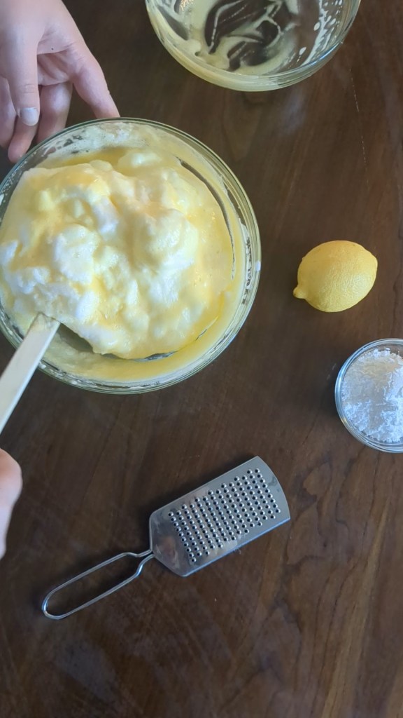 Then I was supposed to mix the two together. I thought about this probably far longer than I needed to, because it simply says mix – and what is the point of just mixing them if we beat them separately? So I again made an assumption that they probably meant to fold them together, and if they didn’t, well, it would be better folded anyway. After that, I added powered sugar – yes, seriously – and lemon rind and folded those in too.