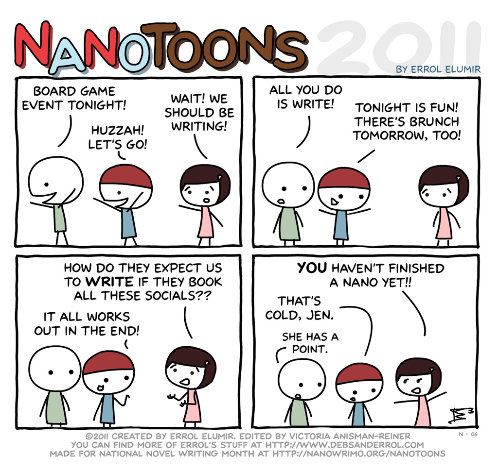 Of course, Tianna did a much better job of writing before she came over and got insomnia last night so right now she is about 4k words ahead of me and I am irritated. But I will catch up! I will. And then I will brag about it. So there. In case you can’t tell, we have an ongoing competition when it comes to NaNo and who gets ahead of whom.