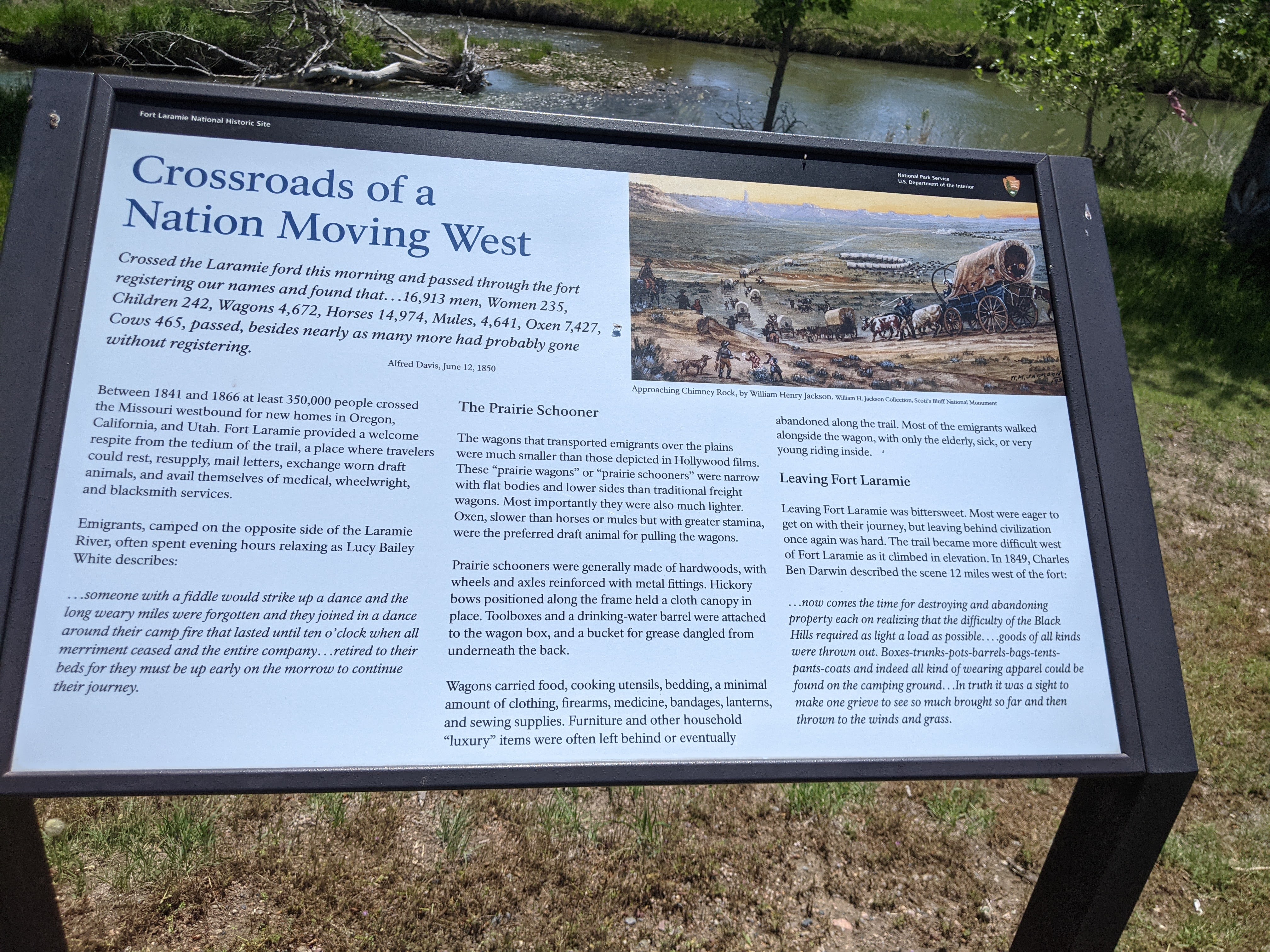 Emigrants rose around 4:00 AM and had around an hour to make breakfast (and often extra for lunch), coffee, pack up the wagon, and hitch the oxen (or mules). Then it was walk, walk, walk, possibly cross a river or three, and walk some more.