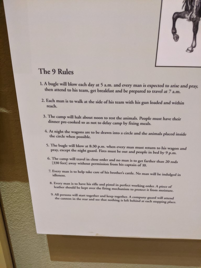 I am, however, sharing a photo below of an example schedule taken at the National Historic Trails Interpretive Center (an awesome museum to visit) that demonstrates what I mean when I said it can vary wagon to wagon. You’ll note that the times and details there are slightly different from the ones I gave.