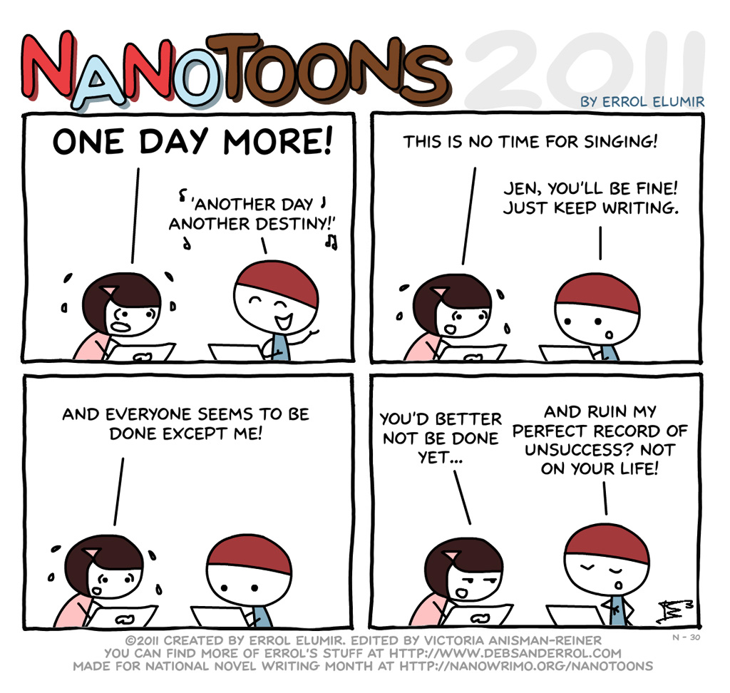 You thought I was done, didn’t you? Well, I had a secret plan… Which I executed perfectly. As you all know, my sister finished the 50,000 words before me. I conceded defeat. However, I decided to take the final day of nano to eek out in front. That’s right, she thought she was safe stopping at 50,500 words. So, I wrote an additional thousand more and stopped at 51,100 words! I promptly bragged about it on Instagram, to which she responded only with a blinking face, but I’m still counting it as a win.