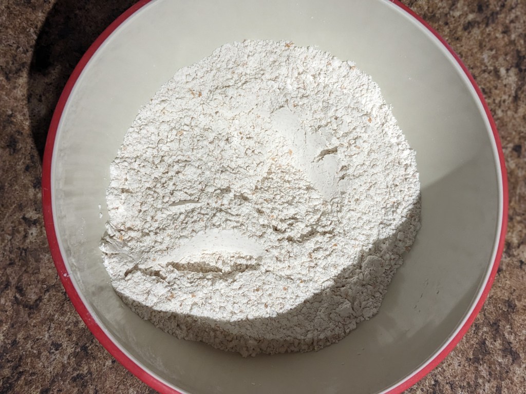 Okay, now, what is this graham flour I mentioned? Well, I wondered the same thing. I thought at first that it was just crushed graham crackers or something. But no. Apparently it is a special type of flour (one that is, in fact, used for graham crackers), and…relatively hard to get. It’s essentially a coarsely ground wheat flour invented by Sylvester Graham (I will say, there is at least one Oregon Trail letter touting the benefits of graham crackers, so whatever the recipe’s questionable ingredients, this isn’t necessarily one of them). The Spruce Eats describes it as “more coarsely ground than standard whole wheat flour, producing a rustic texture and nutty, lightly sweet flavor.” I could not figure out where to buy this flour. I found only one site that sold it and it would have been over $20 including shipping, which I was not willing to spend for a bit of flour. So, I did what everyone else online was doing. I made it myself. Or as close as I could come. I used a recipe from Food.com mixing together white flour, wheat bran, and wheat germ, all of which I could buy from a regular store!