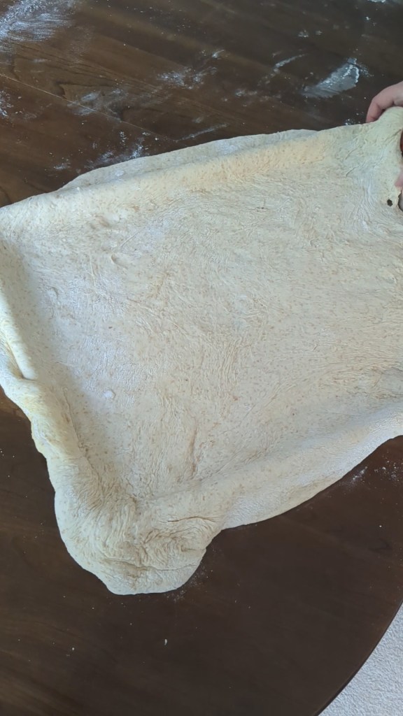 I felt rather sorry that Daniel would have to eat this, but not enough to stop making it. I let the dough rise, and then rolled it out “very thin”. Well, not as thin as I’m sure I was supposed to, but people, that was a LOT of dough. As it was, I had a ton leftover that I didn’t bother to bake. I put it in my largest cookie sheet and it didn’t fit. I probably should have just cut the recipe in half, or at least the dough and tried to get it even thinner, but in the moment it felt like maybe I was over-thinking very thin (now I doubt it).