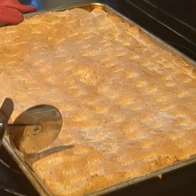 From there, we let it rise again, pricked it with a fork and baked it “until crisp” – it is moments like these that I thought maybe it was an original recipe after all. What temperature? What does until crisp mean? How crisp. SO MANY QUESTIONS! So I just put it at like 400 and baked it until it looked done. Now I’m thinking I should have baked it until it looked burnt. Because when I cut it, it was definitely more like bread than some sort of cracker.