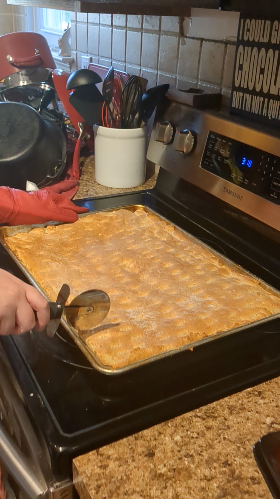 From there, we let it rise again, pricked it with a fork and baked it “until crisp” – it is moments like these that I thought maybe it was an original recipe after all. What temperature? What does until crisp mean? How crisp. SO MANY QUESTIONS! So I just put it at like 400 and baked it until it looked done. Now I’m thinking I should have baked it until it looked burnt. Because when I cut it, it was definitely more like bread than some sort of cracker.