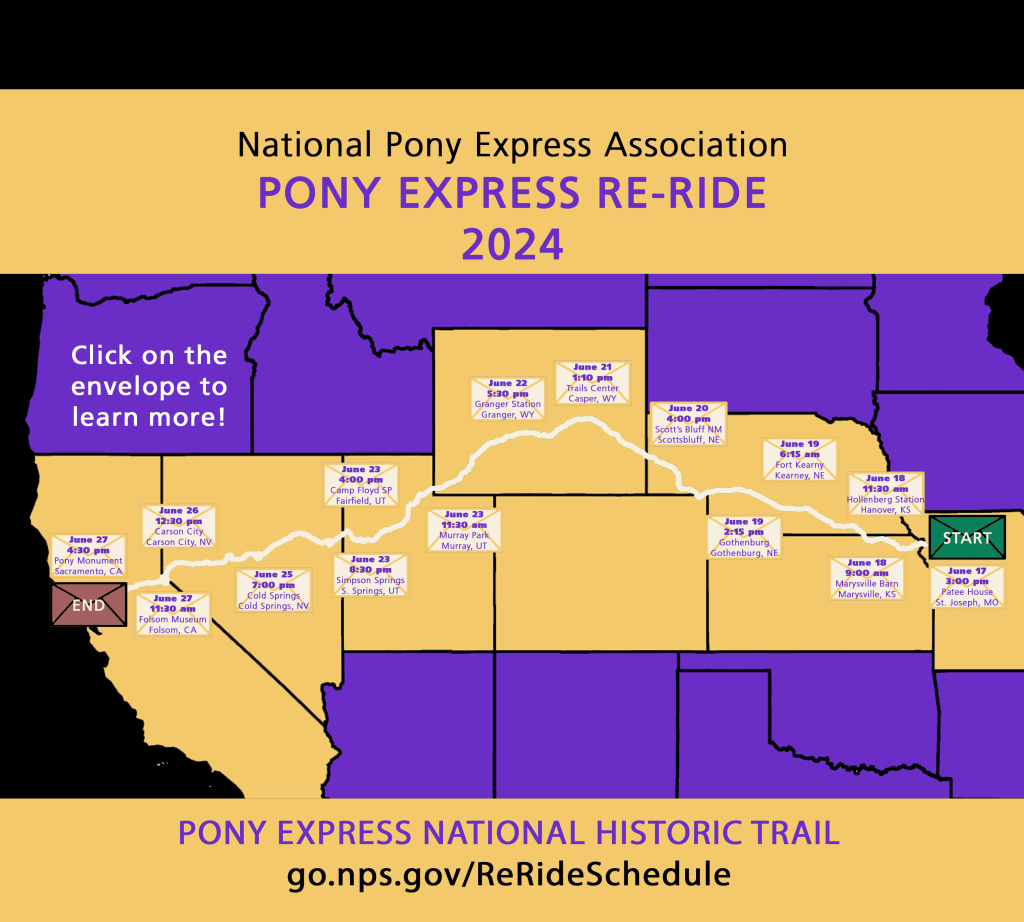 Well, in a manner of speaking. Once a year, there is a pony express ride in which the rider makes his way from St. Joseph, Missouri to Sacramento, CA in ten days. Not only can you go to the stops to see them, but you can even send a letter yourself if you want. Now, sadly, the deadline appear to have already passed for this year to send your own letter, but keep an eye out for next year! This year’s run is taking place from June 17 – June 27, and I’ve copied links with additional information below, as well as the National Park Service’s map of where the riders will be when in case any of you live near enough to see for yourselves (I wish I could!).