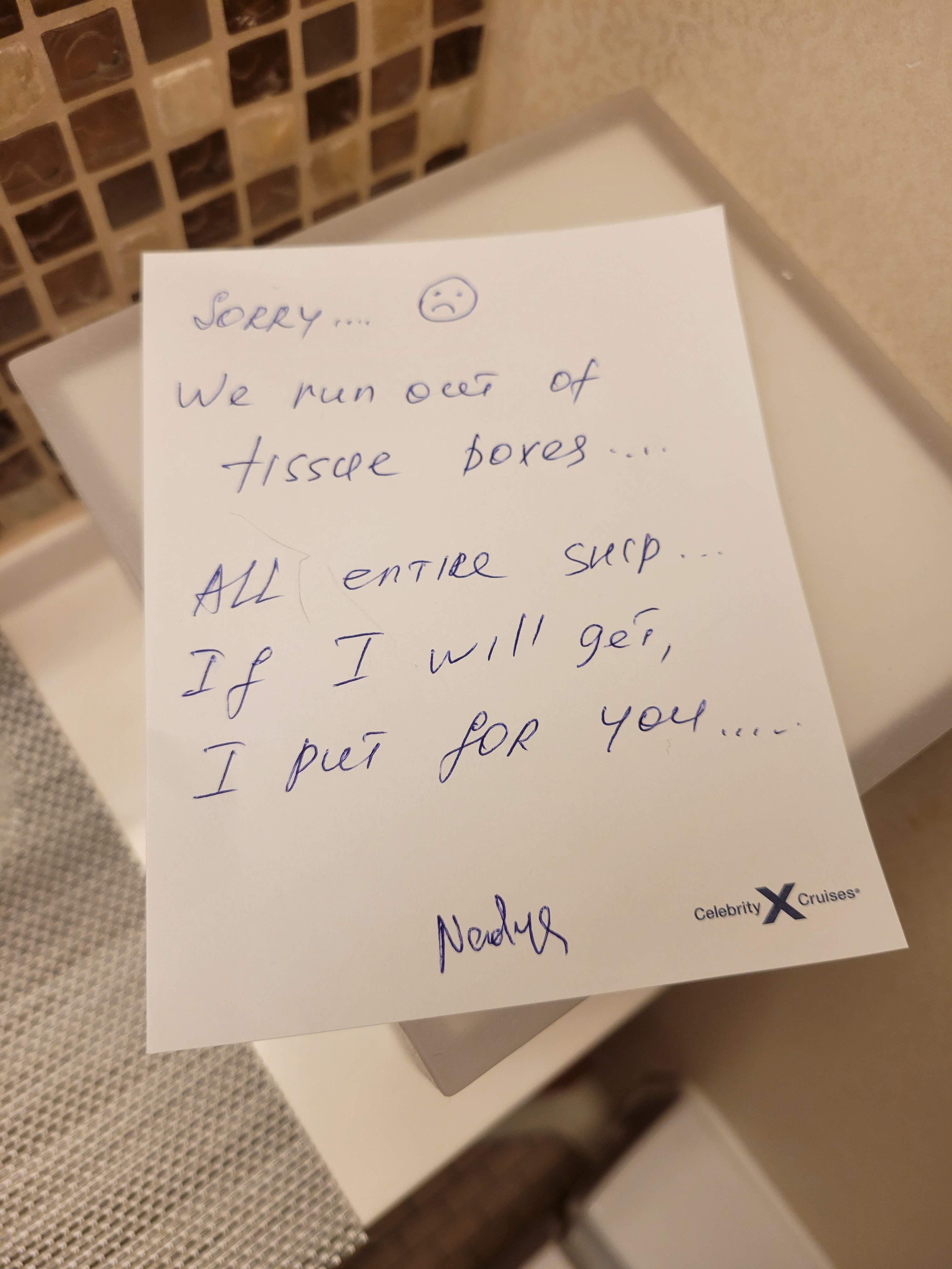 There really wasn’t much to write about yesterday – we were very grateful for a day to stay on board and nurse our colds. We also found out that most of the ship is sick. We had been coming to that conclusion already based on the amount of coughing we heard both around the ship and on buses, but yesterday was the day that our stateroom attendant left a note on top of the empty tissue box letting us know that they were out. As in, the entire ship had run out of tissues. I no longer feel guilty for potentially spreading my cold. I now blame the rest of the ship for giving it to me. We did dress up for the formal dinner night, which was also fun, but were so tired, that we went straight to bed after dinner.