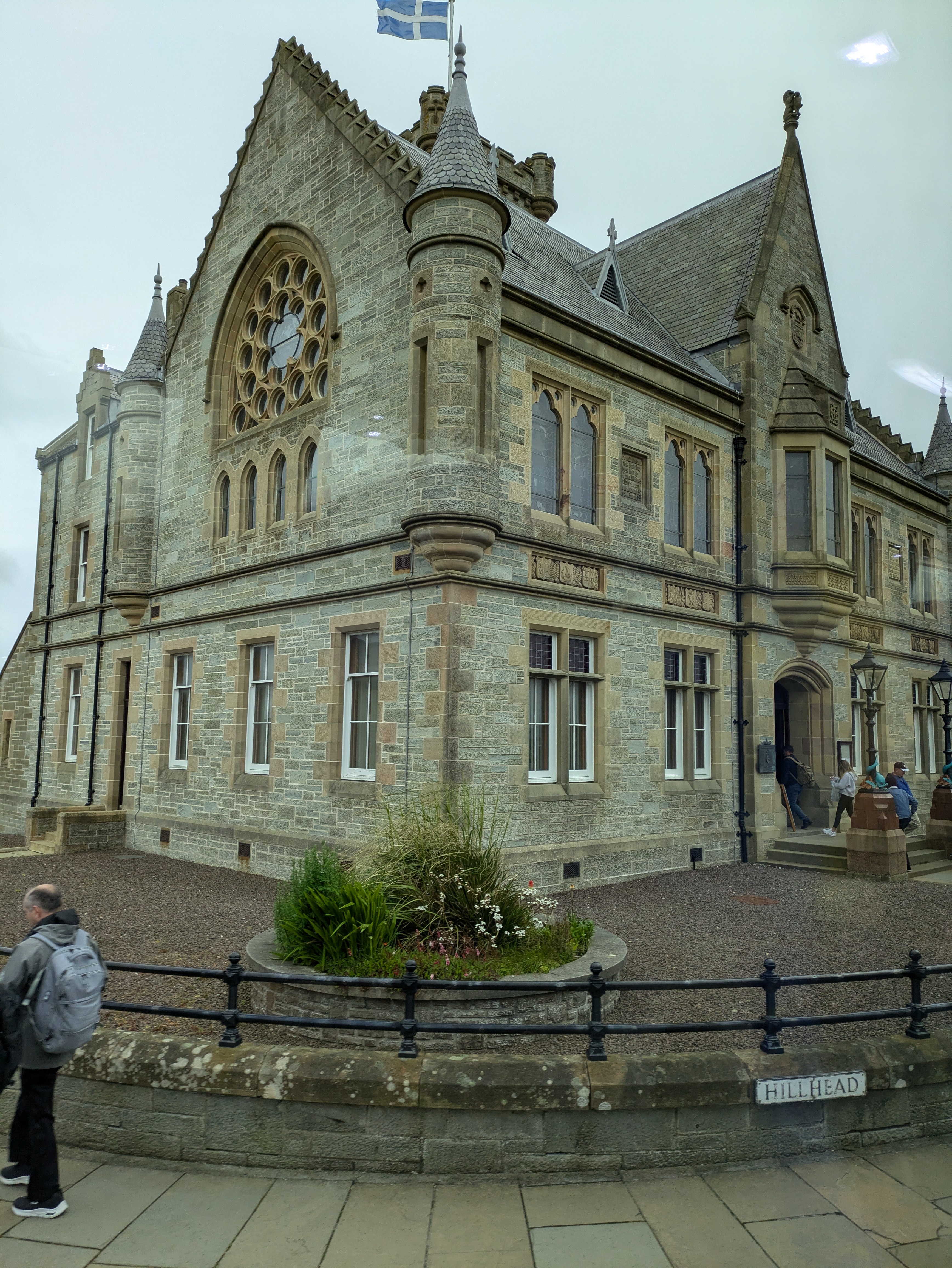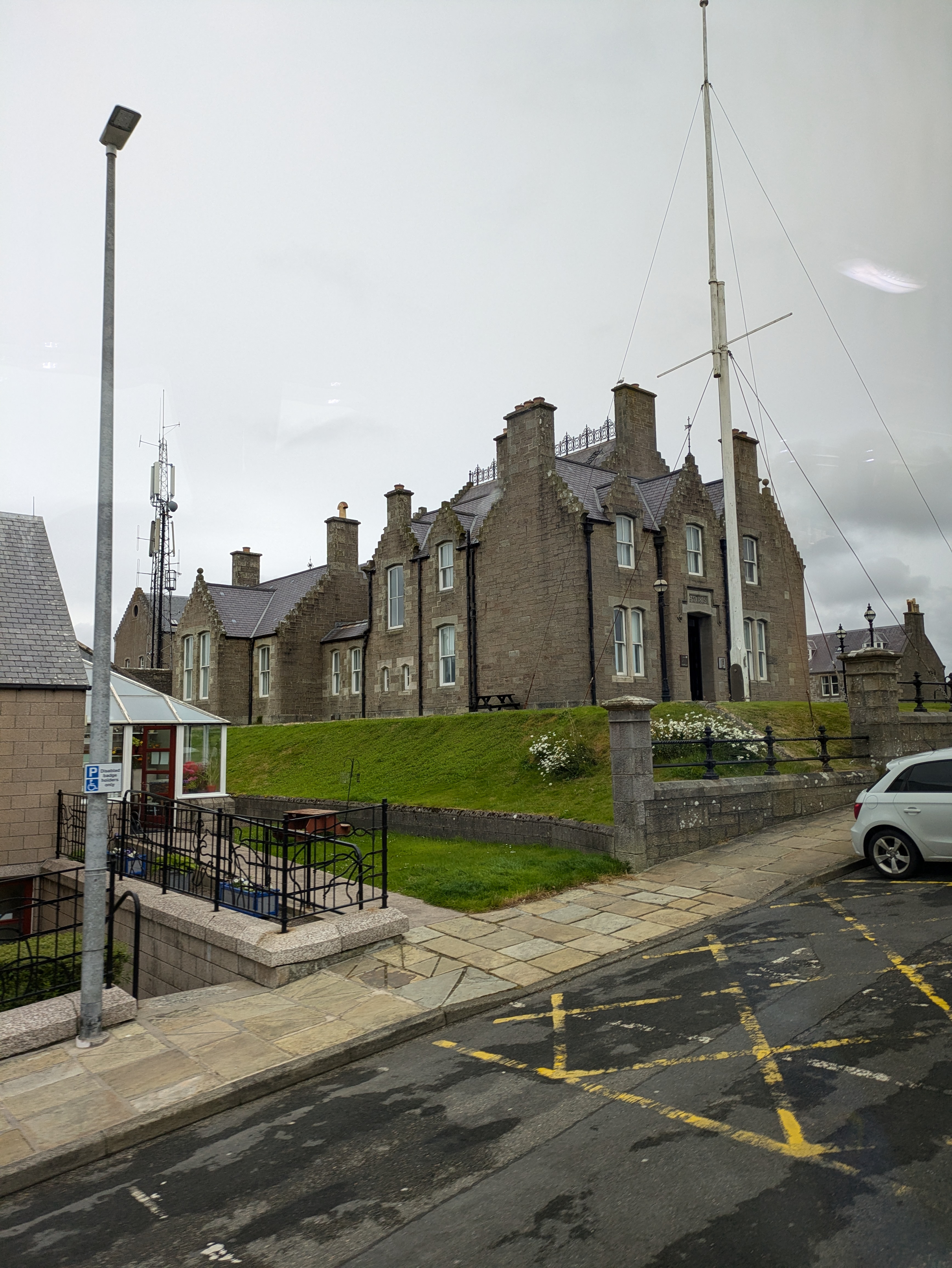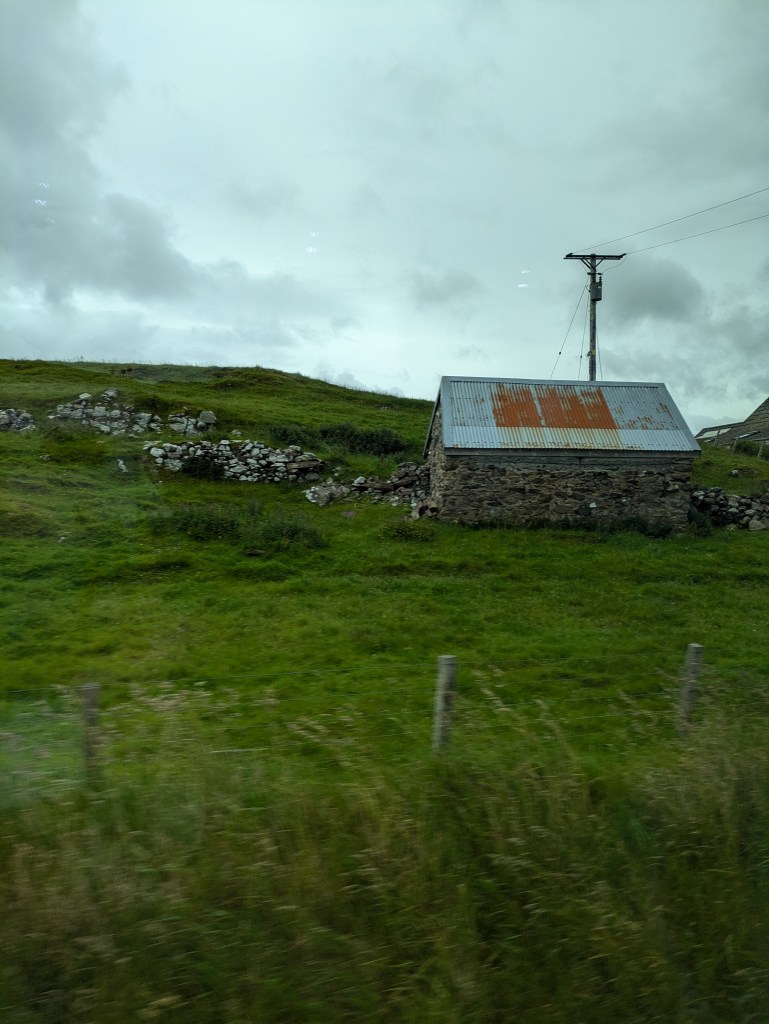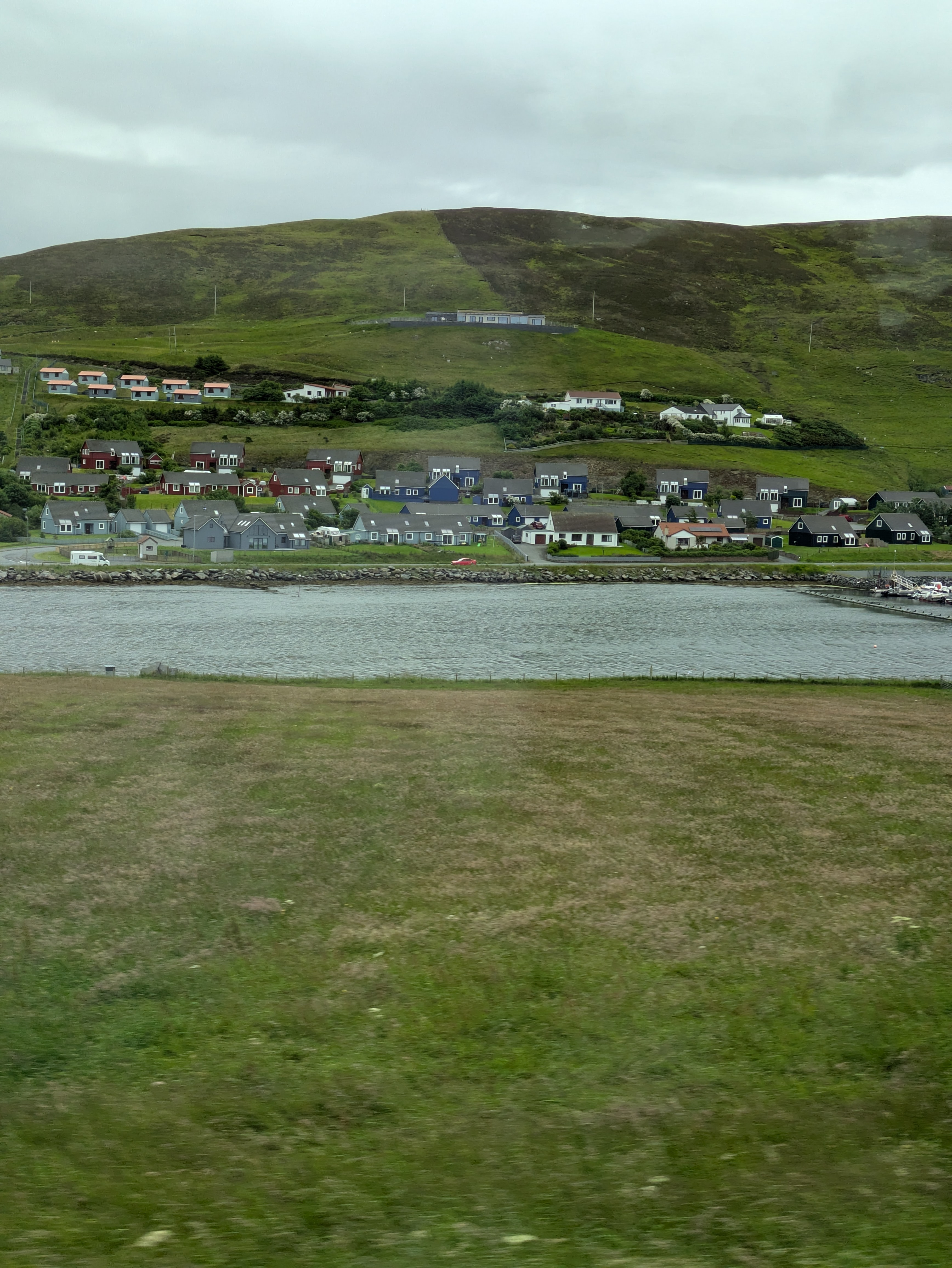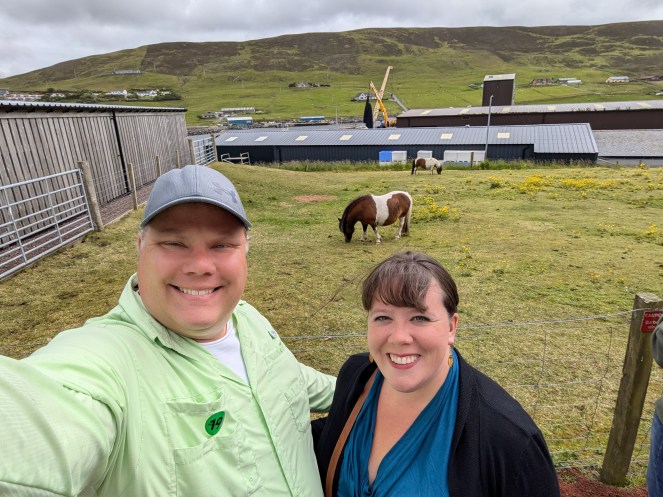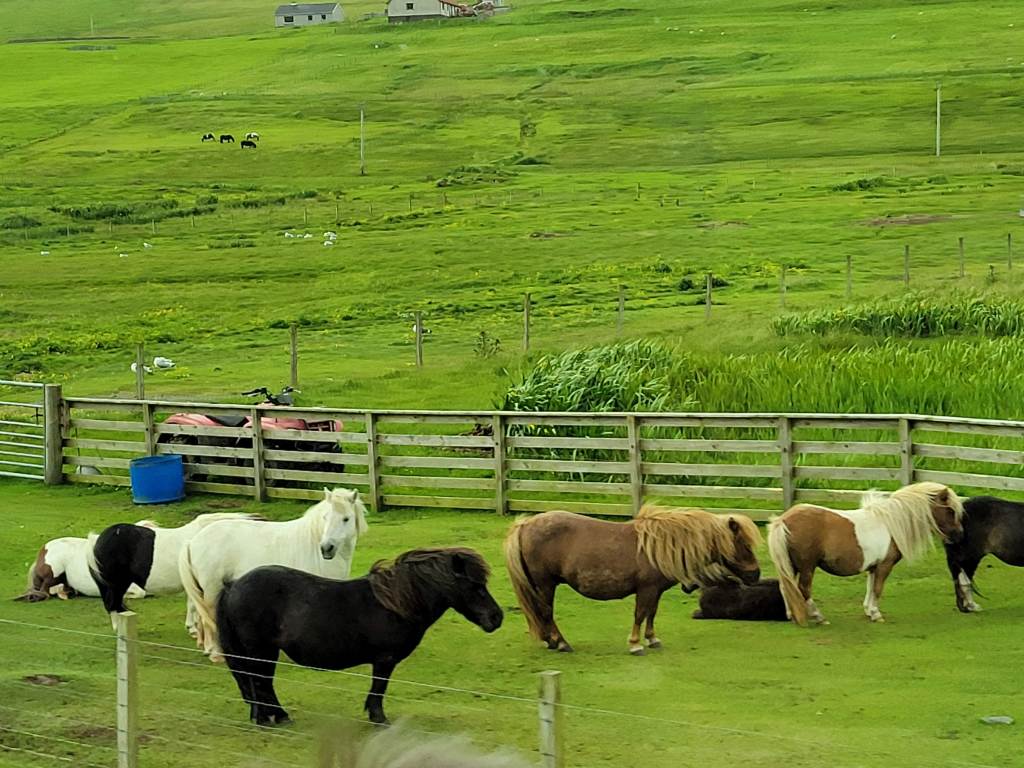 We drove through more countryside with a couple photo opportunity stops, lots of stories about Scottish history, a surprising amount of World War II history, sites related to the show Shetland, and how Shetland ponies used to be used (specifically, working mines, because they were small and sturdy enough to do so), and then drove by some! You can see how windy it is based on their manes and the trees behind them. We were told the wind was nothing compared to how it usually was.