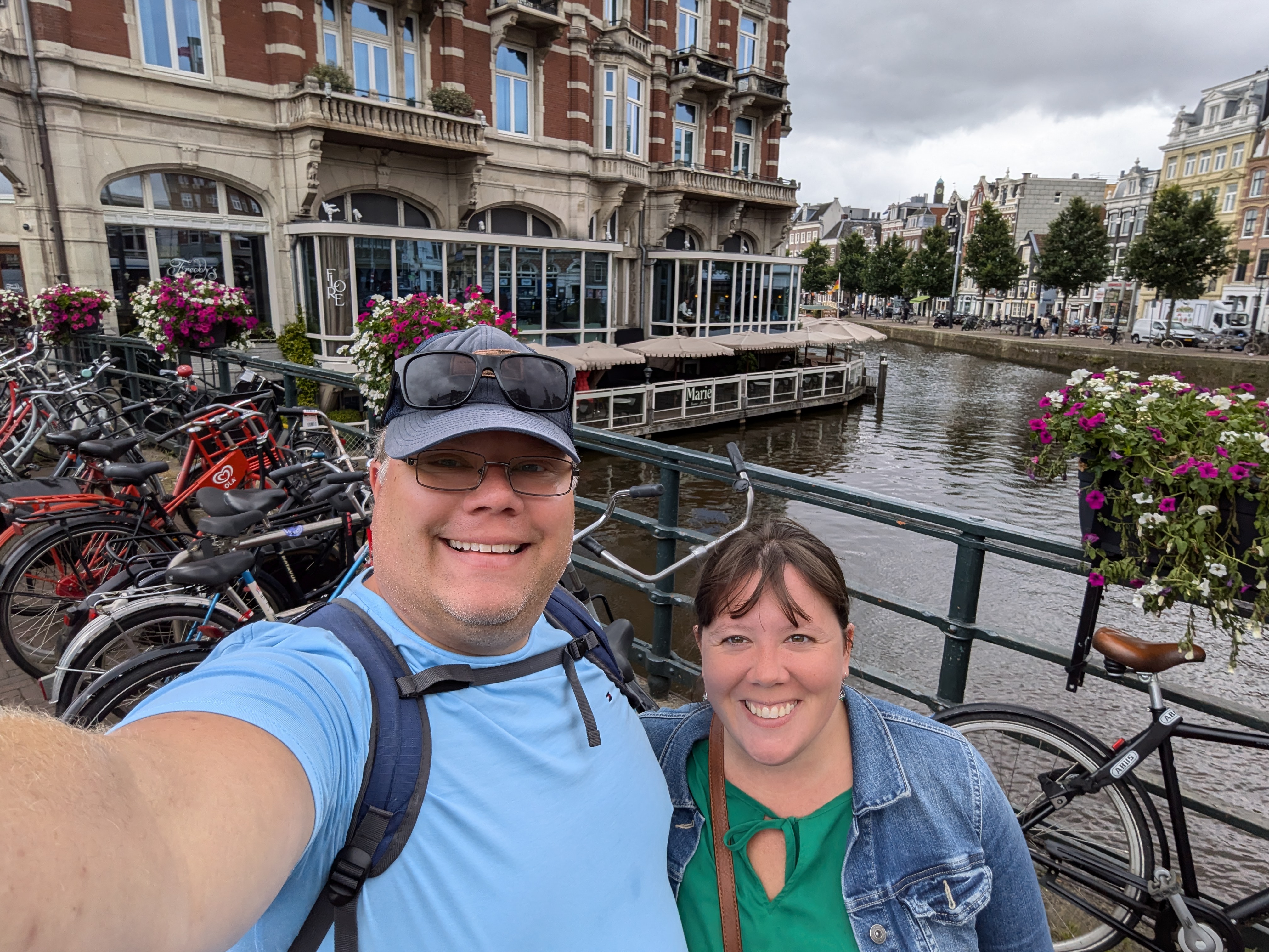 Our first glimpse of Amsterdam wasn’t what I expected. I was kind of envisioning quaint, pretty, colorful houses and buildings, flowers everywhere – maybe even strolling minstrels (okay, maybe I’ve seen one too many fairytale-like drawings). My first impression was that everyone was cranky (oh my gosh, so much yelling and honking), the buildings were dingy, and everything was dark. Which might have been influenced by the fact it was a cloudy, rainy day. Also, they were not lying about the amount of bikes everywhere! But the taxi driver, once he got past the initial crush of vehicles trying to get out of the port, zipped up and down and through lanes with a dexterity that was almost frightening, especially when he would go around traffic by taking the tram lanes! But he seemed to always know which way he could go. He also seemed very relieved to drop us off – probably due to the amount of coughing. I can’t blame him.