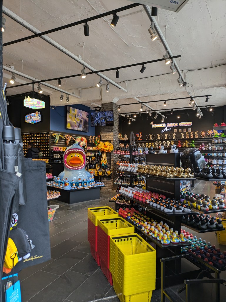 My impression of Amsterdam, I must admit, did not improve much. Once I could get over the dark dinginess, the architecture of the buildings was nice, but everywhere we went people were smoking, so I had to hold my breath like half the time to avoid constantly pulling out my inhaler. The canals were pretty, though, and we found one spot that had bikes, flowers, and a beautiful view – far more similar to what I thought Amsterdam would look like. We also found a couple of rubber ducky stores – literally shelves upon shelves of rubber ducks! It was both very funny and fun to look at! But also so expensive. I was not spending 10 euros on a rubber duck.