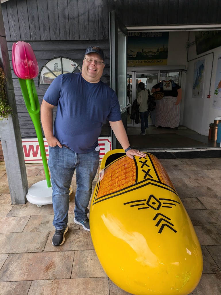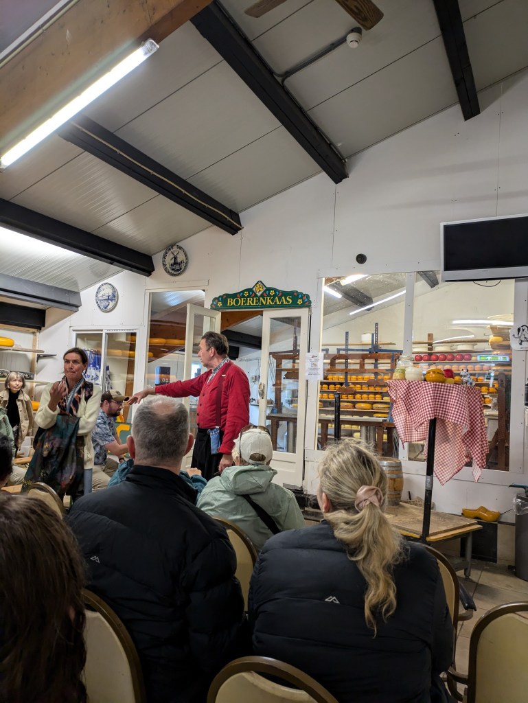 And then, the stop I admit I was most looking forward to – the cheese factory! It was called De Simonehoeve and I made Daniel get a picture next to their giant wooden shoe (he’s lucky we were in a hurry or I would have made him get inside it). We were all herded into a large room where the gentleman who (I think) ran the factory explained how cheese was made, and how long young cheese was aged vs old cheese (ranging from months to years), etc. And then he brought us into the next room and made a wooden shoe to show us how they were made with modern machinery, and showing us different types of wooden shoes. After the presentations, many people looked through all the different wooden shoes for sale (of all sizes and types!), but, predictably, Daniel and I went straight for the cheese room, where we proceeded to add two more pounds of cheese to the four we were already bringing home, and then took a picture in front of their mini windmill outside.