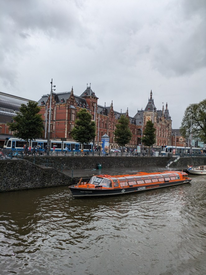 We stopped by a pharmacy to try and find more meds for our flight the next day and succeeded only in locating some Ricola cough drops, passed a supposedly Italian bakery boasting of delicious-smelling pizza and delicious-looking cheesy pretzels and couldn’t resist stopping. We won’t make that mistake again. I don’t know how pizza can smell that good and be THAT dry and bland. Same with the pretzel. I mean, we did finish them – but mostly because we were hungry. Back in the hotel, we rested awhile, packed for tomorrow, and then changed and headed back out for our wine and cheese cruise! Now that I would go back to Amsterdam for. They had such a nice little set-up, with a platter of different types of cheese, dipping sauces, peanuts, and bread, and then we could choose between red, white, and rose wine. It was so fun being so close to the water and Amsterdam from the canal itself was so much prettier. We chatted with the couple who sat next to us, who were quite nice and had just started a month-long vacation, and I still pray we didn’t get them sick!