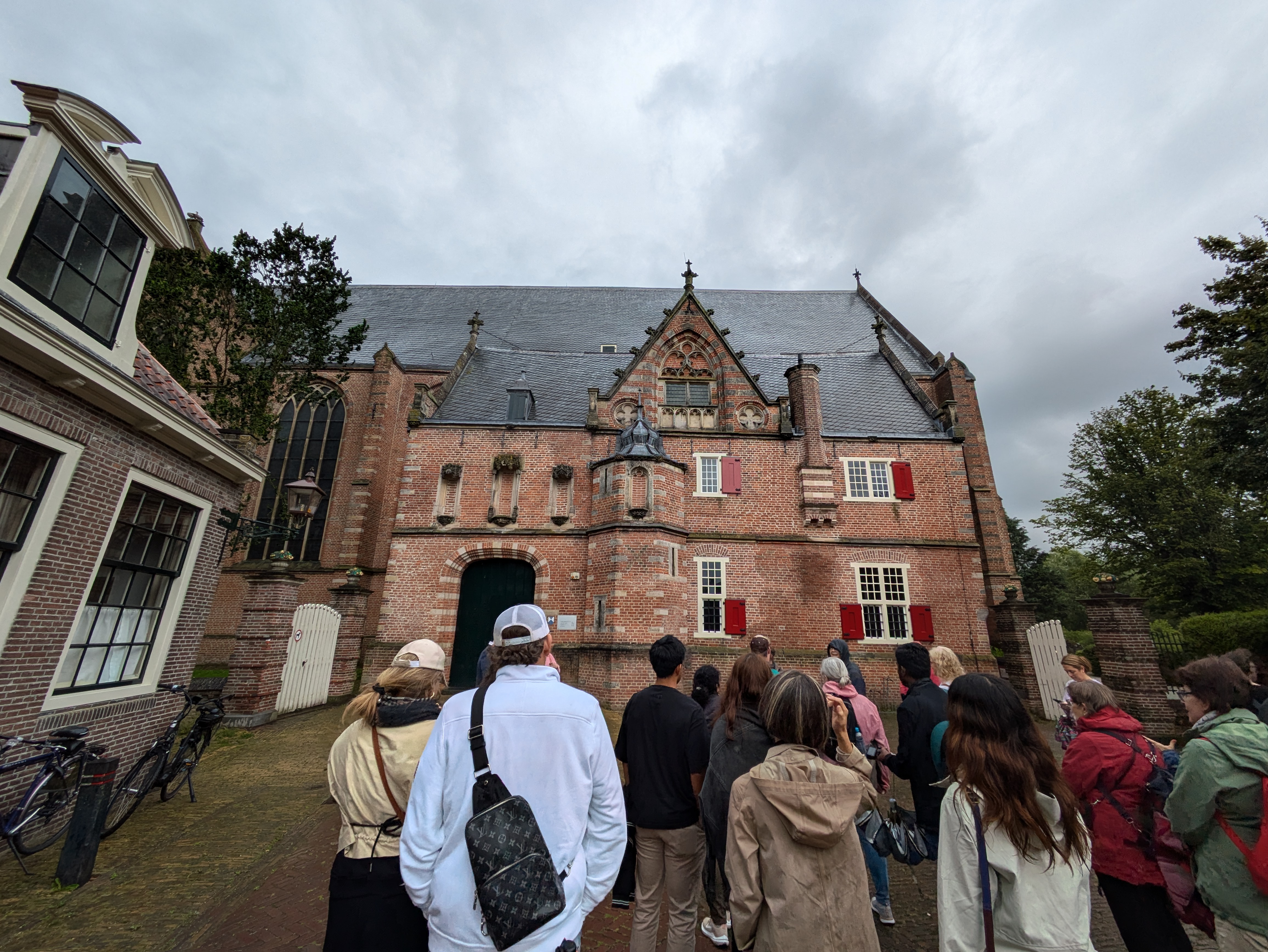 And it was SO PRETTY. Now that was what I had been imagining Amsterdam itself would look like. As soon as we got out of the city, we started seeing beautiful countryside and cute homes. And our very first stop was to see some windmills at a place called Zaanse Schans. While clearly catering to tourists, it was still so much fun to walk through the cute little village-like place and take pictures next to windmills that, while not currently being used for anything other than show, used to be working windmills! There were also black sheep there, which I don’t think I’ve ever seen in real life before. We walked through a cheese store and got to do some more tastings, which, considering my love of cheese, was awesome, and bought a delicious ham and cheese croissant sandwich and coffee. This was our first time having to pay to use a bathroom, and it was a good thing they had credit card machines because we haven’t picked up any Euros yet.