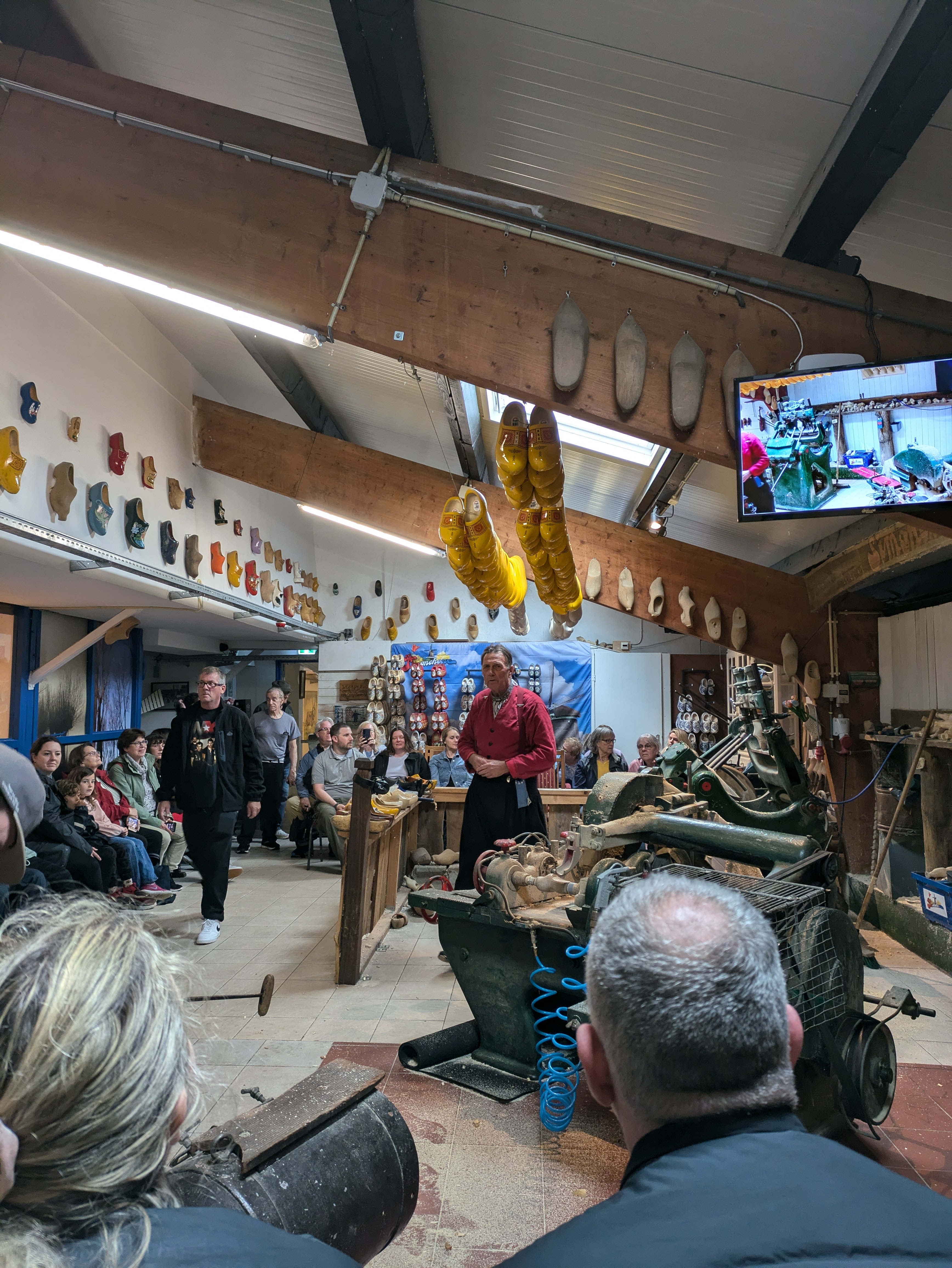 And then, the stop I admit I was most looking forward to – the cheese factory! It was called De Simonehoeve and I made Daniel get a picture next to their giant wooden shoe (he’s lucky we were in a hurry or I would have made him get inside it). We were all herded into a large room where the gentleman who (I think) ran the factory explained how cheese was made, and how long young cheese was aged vs old cheese (ranging from months to years), etc. And then he brought us into the next room and made a wooden shoe to show us how they were made with modern machinery, and showing us different types of wooden shoes. After the presentations, many people looked through all the different wooden shoes for sale (of all sizes and types!), but, predictably, Daniel and I went straight for the cheese room, where we proceeded to add two more pounds of cheese to the four we were already bringing home, and then took a picture in front of their mini windmill outside.
