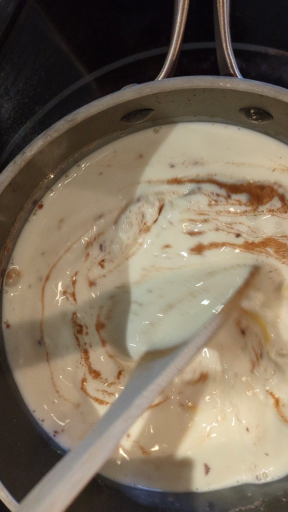 The very first thing I was instructed to do was prepare a custard. Thankfully, there was a custard recipe on the page before, so I started with that. First, I boiled milk with some cinnamon or lemon peel…while it boiled I made the mistake of working on another part of the recipe, so there may have been difficulties involving smoke alarms….but eventually I got it straightened out, strained any burned bits, and it was (almost) as good as new! Ahem. But back to business.