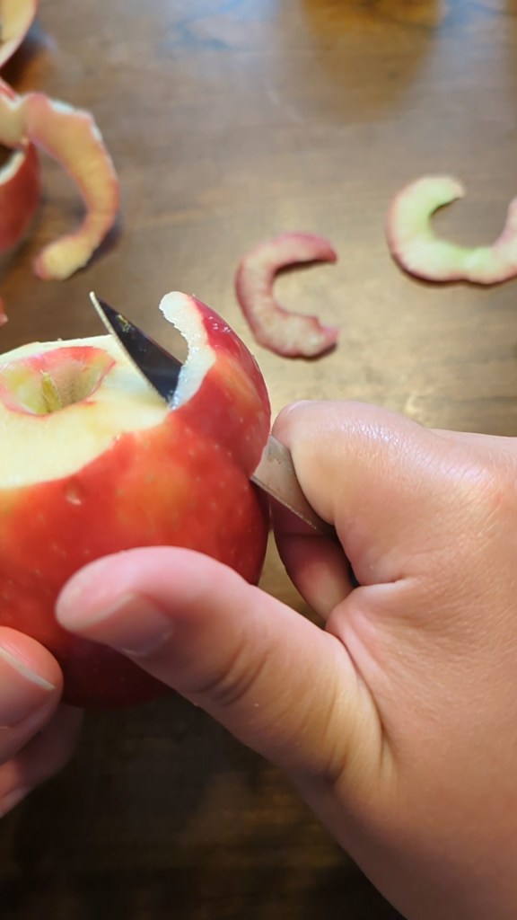 Meanwhile, while the milk boiled over and then cooled, I was instructed to pare “eight to ten pleasant apples”. (Spoiler alert: Maybe they weren’t pleasant enough and that’s why I should have put in more sugar.) But at any rate, I was to dig out the core while leaving them whole, which is the point at which I realized I don’t actually own a corer…at least not one that doesn’t also slice it at the same time. The amount of work that goes into taking out the core of an apple without breaking it is, without doubt, one of the most underappreciated skills of historical cooking. But I eventually accomplished it, even if it took me about three times as long as I would have thought.