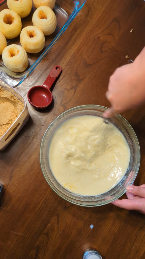 Once the milk was cooled, I whisked in eggs, brown sugar, nutmeg, and salt. Of course, it didn’t tell me how much of any of the spices or sweeteners to put in, so that was all guess work (this is the part where I should have put in more sugar). Setting the apples in a pan, I poured the custard over them and baked them for 30 minutes.