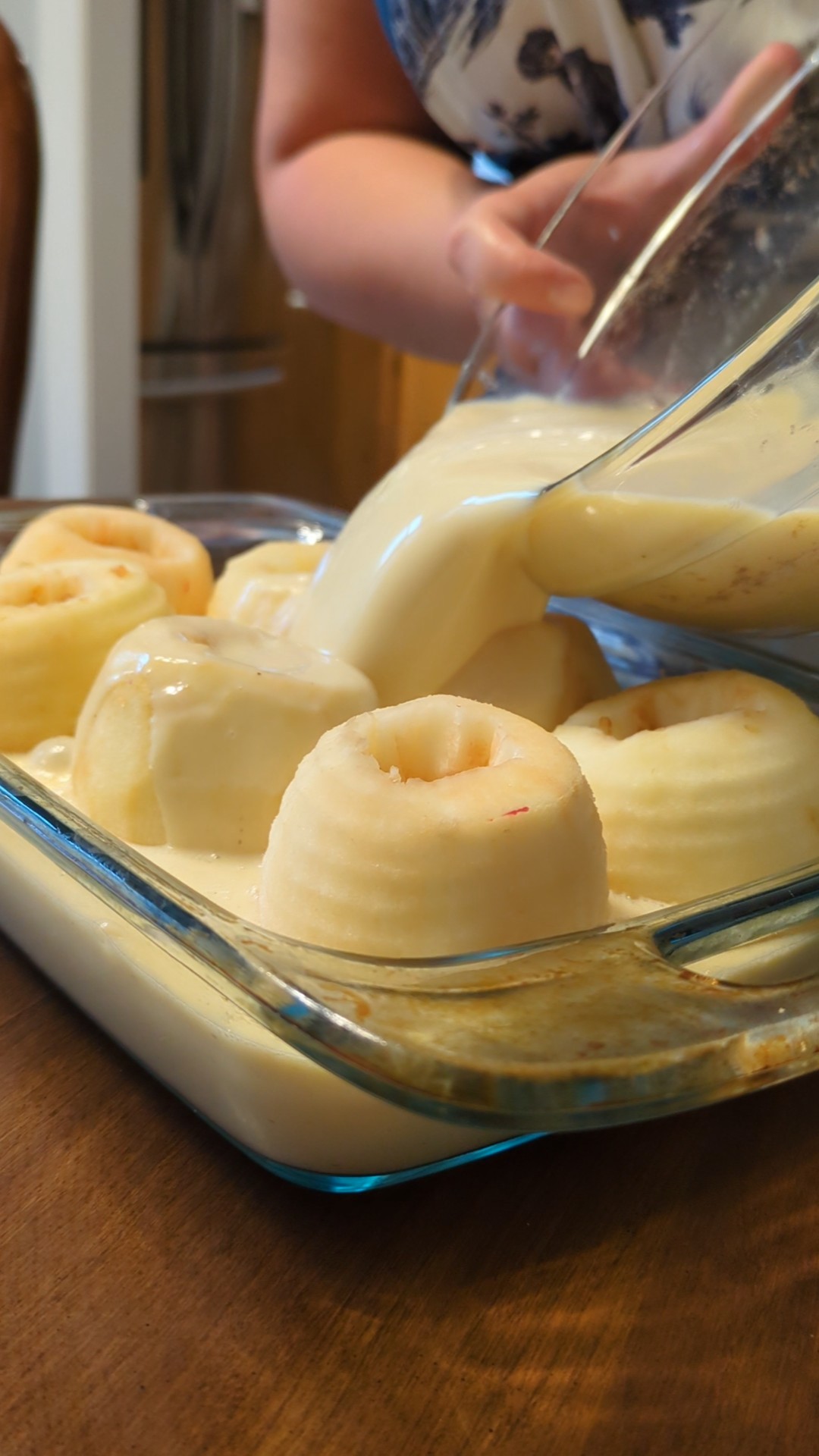 Once the milk was cooled, I whisked in eggs, brown sugar, nutmeg, and salt. Of course, it didn’t tell me how much of any of the spices or sweeteners to put in, so that was all guess work (this is the part where I should have put in more sugar). Setting the apples in a pan, I poured the custard over them and baked them for 30 minutes.