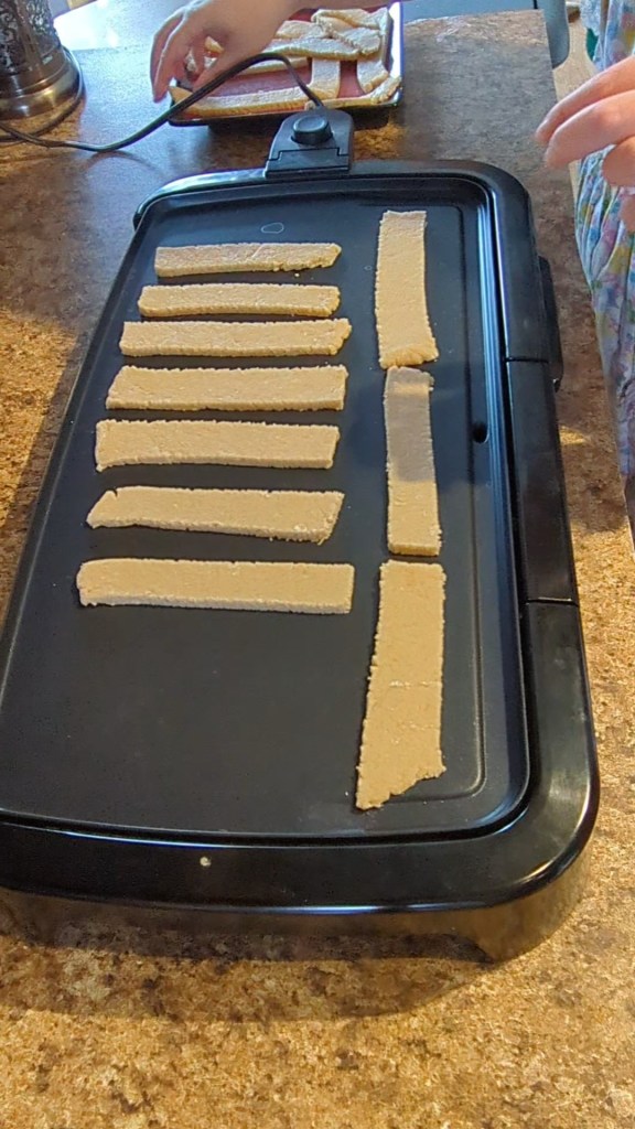 Step Five: Cut it in strips and bake them on a griddle. Well, that explains the whole kneading and rolling thing. But this did give me some heartburn. What did it mean when it said to “bake” on a griddle? Was I supposed to cover it up somehow? Put it on a griddle and stick it in the oven? Finally, I decided to treat it like a griddle cake…which made sense once I thought of it that way, and I went ahead and just used a regular griddle, flipping it the way you do pancakes! I can’t promise this was the most genuine way to do it, since if one were to put it on a griddle in a fireplace, there is bound to be some heat over the top as well, but it’s as close we are getting until I get my own 19th century kitchen.