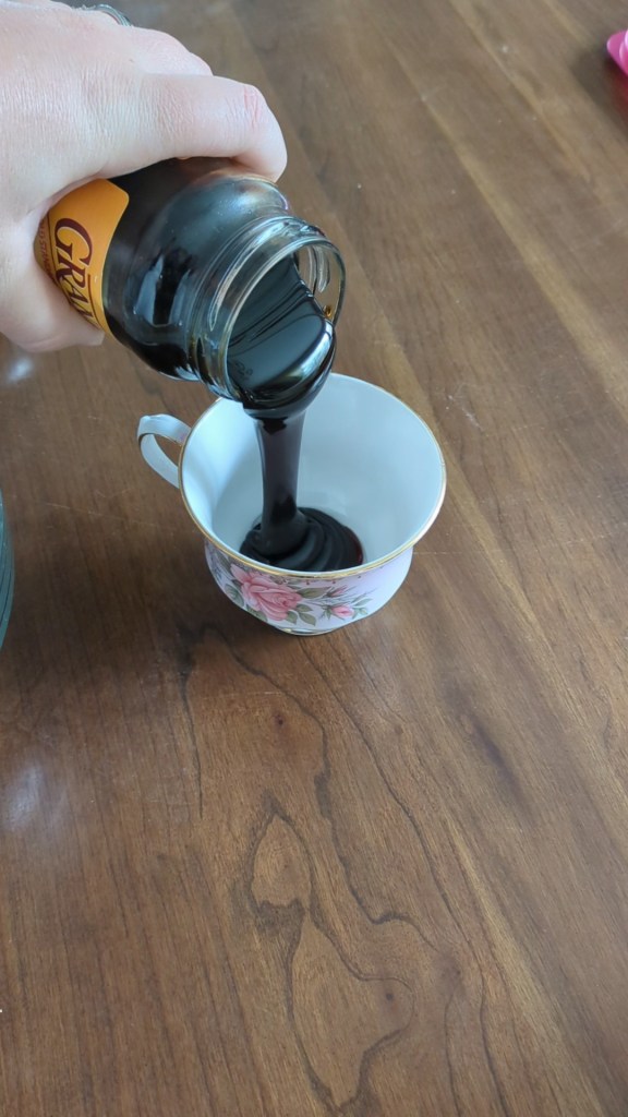 Step One: First of all, most of these steps were actually a single sentence. But I split it up so I actually had something to write. And first step? Start with two tea-cupfuls of molasses…now, according to my vintage measurement chart, that is about half a cup – but I decided to actually take a teacup and measure it out! When I did so, the teacup was definitely larger than half a cup…so I only partially filled the teacup.