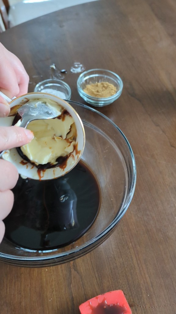 Step Two: One tea-cupful of butter – thankfully, when I smashed a half cup of butter into the teacup, it turned out to be about the same amount as the molasses I used, so I knew the measurements should be about right.