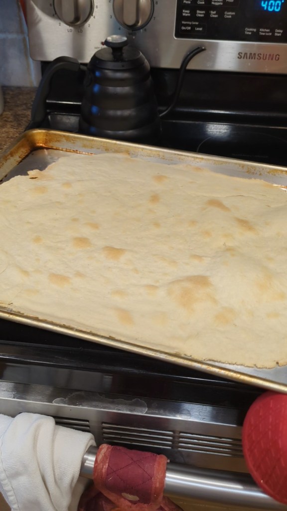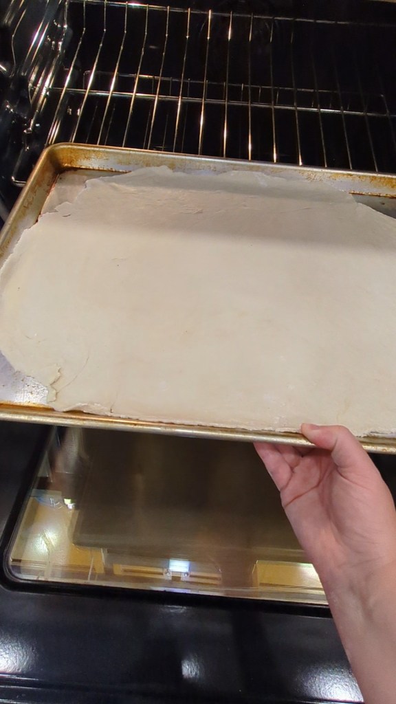 I opted for 400 degrees, because it is a bread dough, and left it as one piece, since her other recipes specify if I am supposed to cut dough into squares. I left it in for ten minutes. And pulled it out with some golden brown spots, so kind of failed at the “look white” situation. But considering it looked white before I put in the oven in the first place, I don’t know what to tell you.