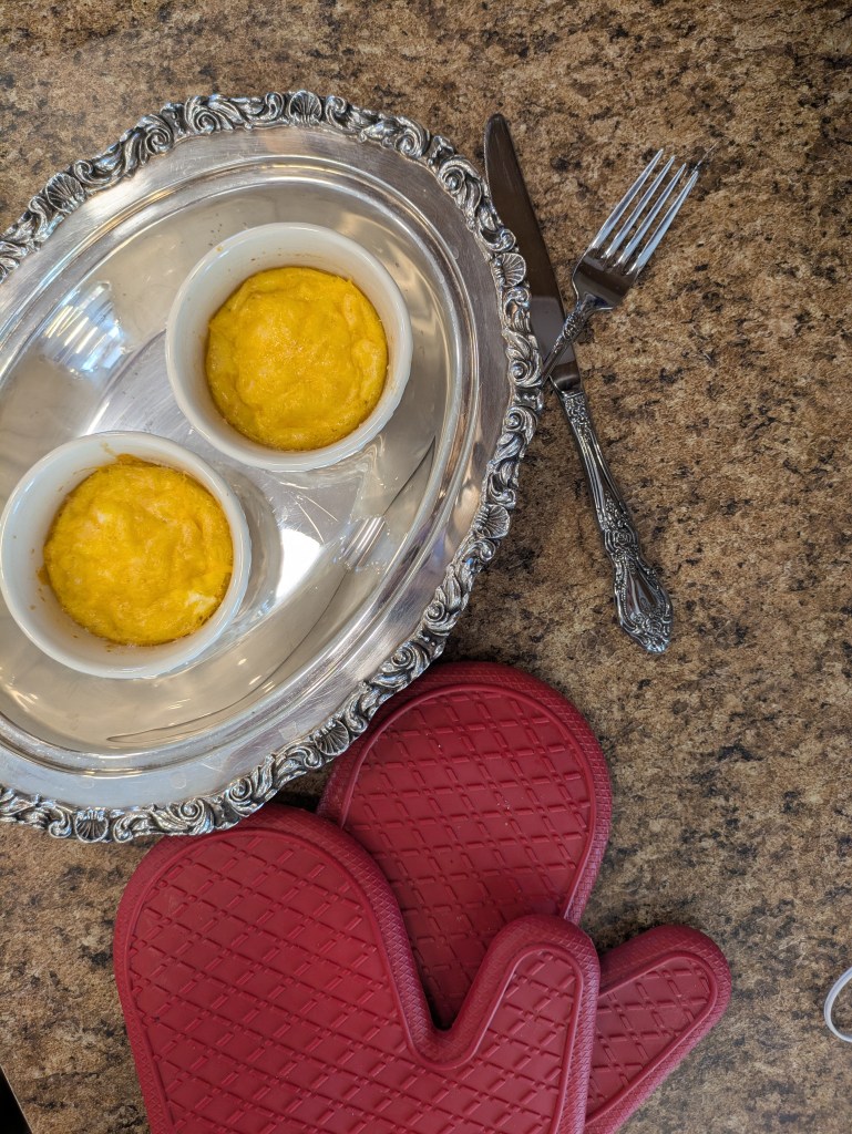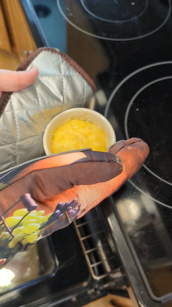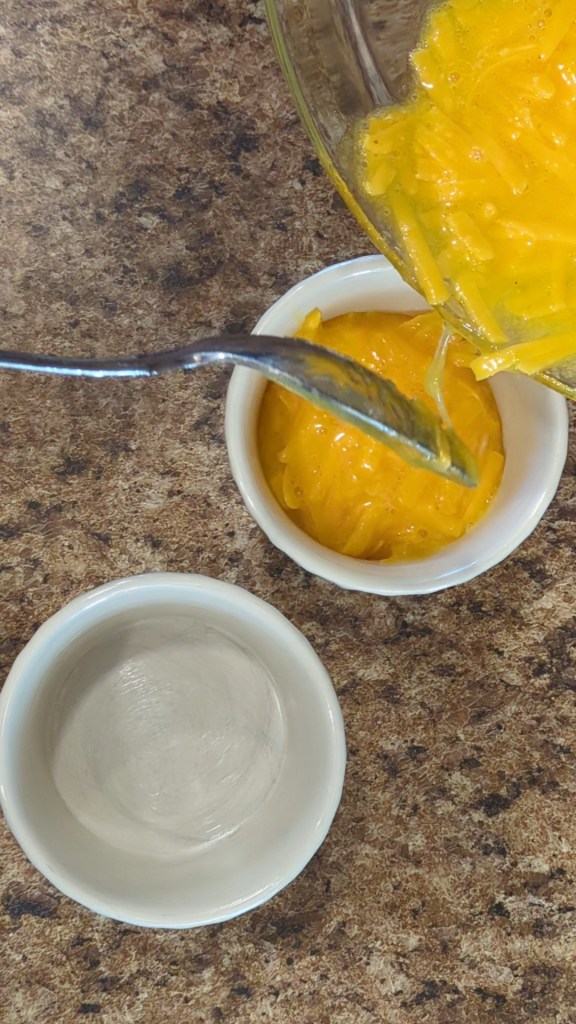 Step Four: Mix with the cheese and pour into buttered ramekins. Of course, it didn’t tell me how many ramekins. Or how full it was supposed to be. Considering the tiny amount this made, I decided on two ramekins and even that seemed like almost too much.