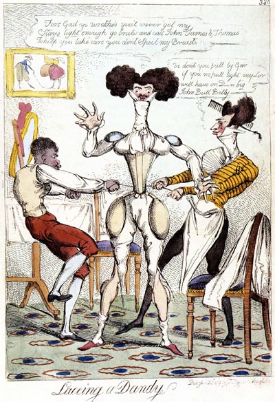 - Corsets were still a thing for men. Cunnington quotes the Diary of a Dandy from 1818 to note some associated difficulties, “Ordered a pair of Cumberland corsets with a whalebone back, a caution to the unwary. The last pair gave way in stooping to pick up Lady B.’s glove.” (Cunnington and Cunnington, 107.)